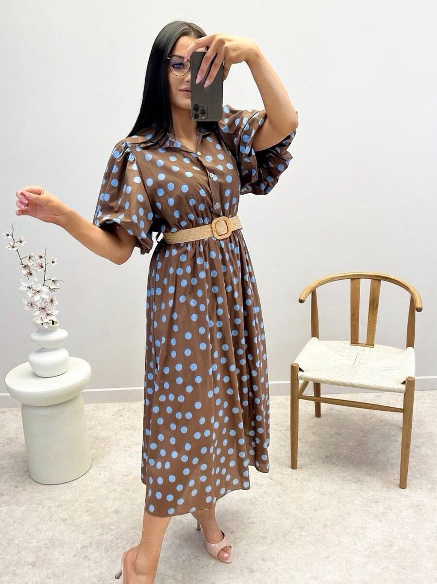 Poczuj powiew letniej elegancji i retro szyku. Nasza rozkloszowana sukienka midi w kropki to model, który skradnie serca miłośniczek naturalnych materiałów i kobiecych fasonów. Łączy w sobie najgorętsze trendy sezonu: objętościowe rękawy oraz plecione dodatki, tworząc stylizację idealną na wakacyjne spacery, letnie przyjęcia czy garden party.