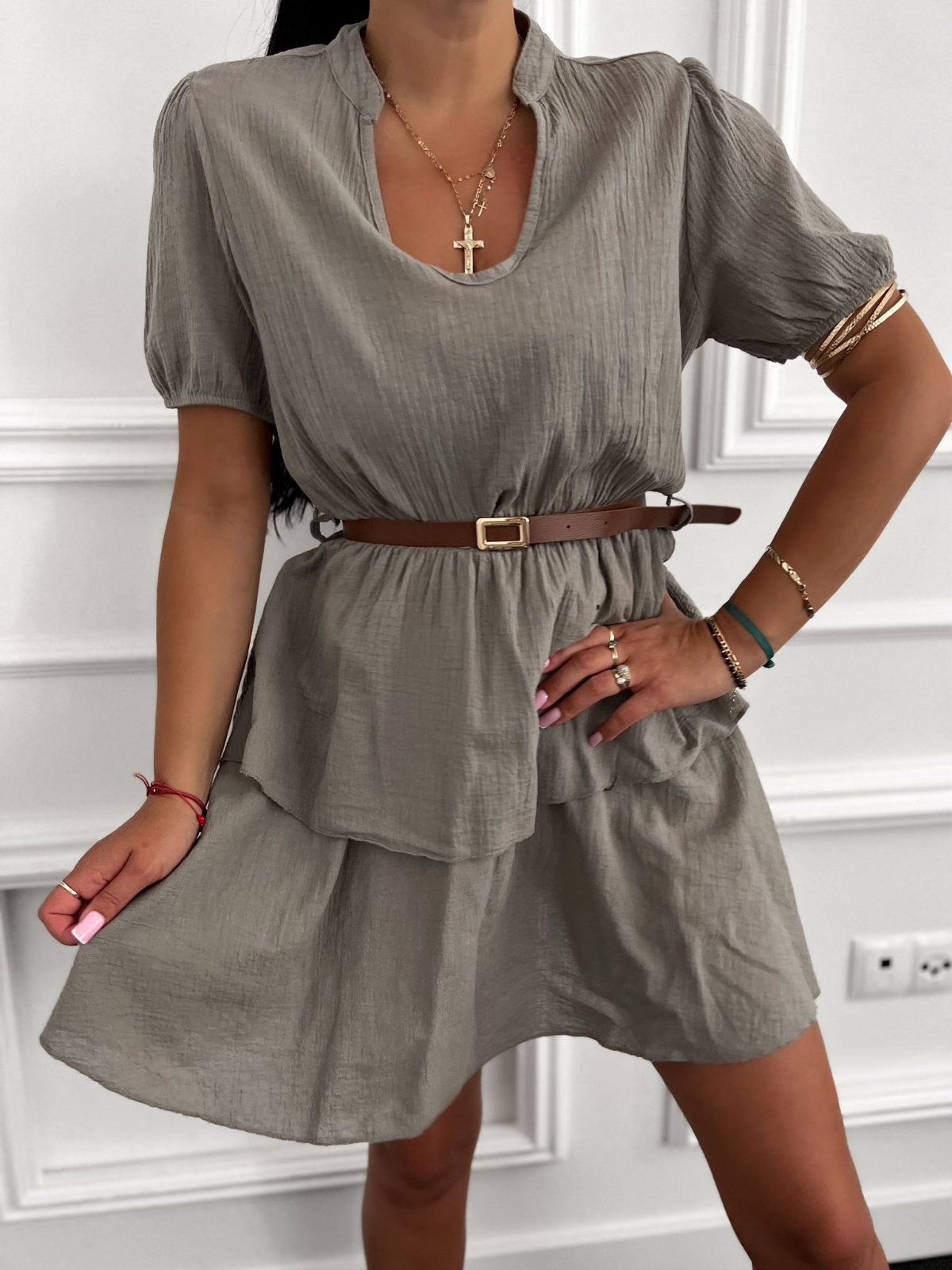 Talia z paskiem w zestawie: Sukienka posiada ozdobny pasek z ekoskóry w kolorze brązowym ze złotą sprzączką, który jest dołączony w zestawie. Pasek doskonale podkreśla talię, nadając całości szyku. Możesz go również nosić bez paska dla efektu luźnej tuniki.