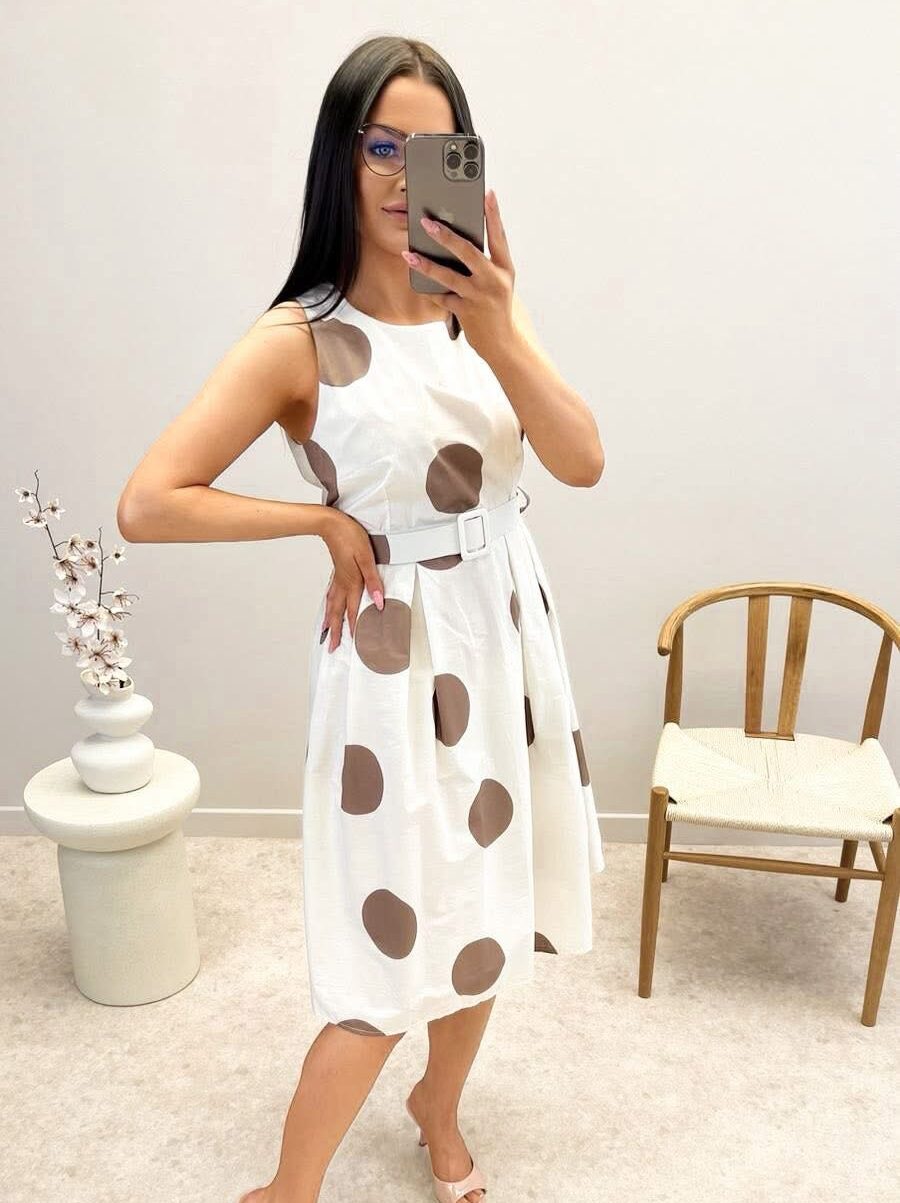 Szukasz sukienki, która jest równie wygodna, co elegancka? Nasza bawełniana sukienka midi w brązowe grochy to propozycja dla kobiet, które cenią naturalne materiały i przemyślane kroje. Klasyczny wzór w kropki na tle w kolorze ecru nadaje jej lekkości, a długość za kolano sprawia, że jest to idealny wybór na letnie przyjęcia, spacery czy spotkania z przyjaciółmi.