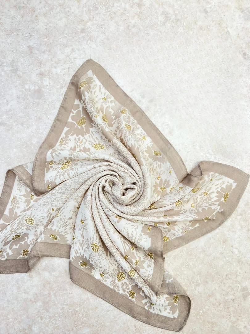 Postaw na wyrafinowany dodatek, który nada Twojej stylizacji luksusowego charakteru. Nasza kwadratowa gawroszka w odcieniach beżu i złamanej bieli to pochwała ponadczasowej elegancji. Delikatny, kwiatowy motyw z subtelnymi, złotawymi akcentami sprawia, że jest to akcesorium niezwykle twarzowe i łatwe do zestawienia z resztą garderoby.