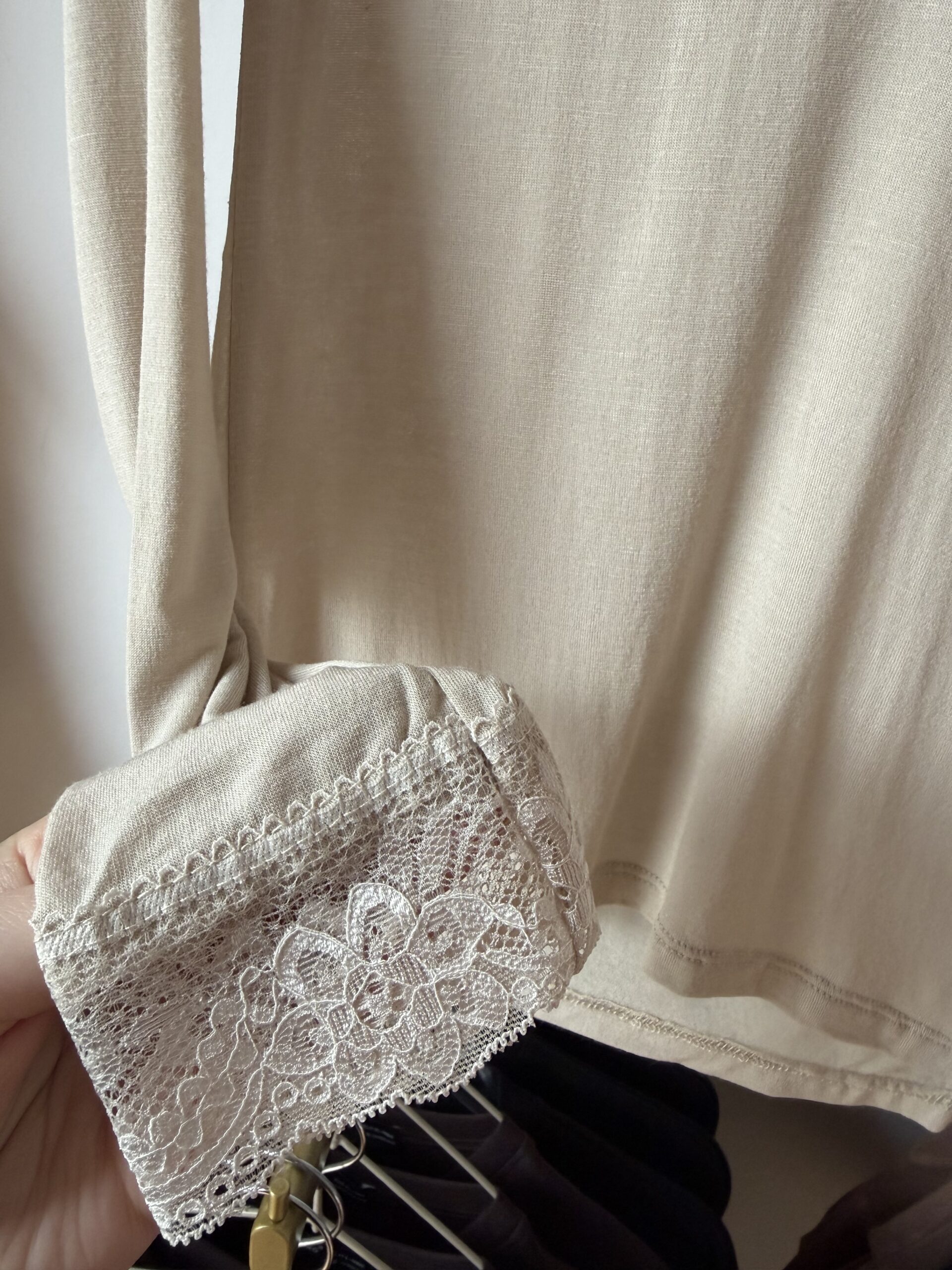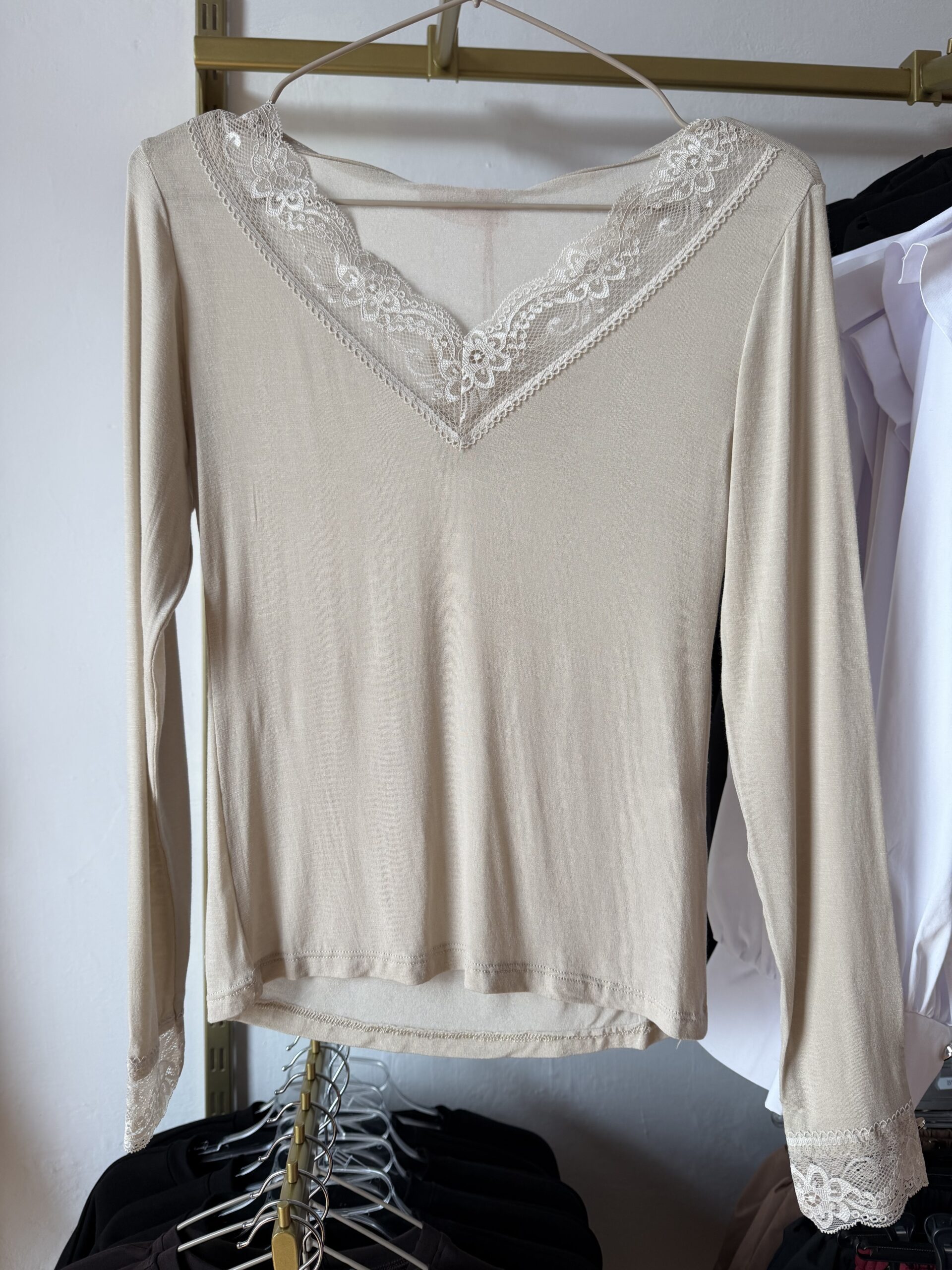 Cienka bluzka wykończona subtelną koroną. Idealnie sprawdzi się pod swetry czy marynarki.