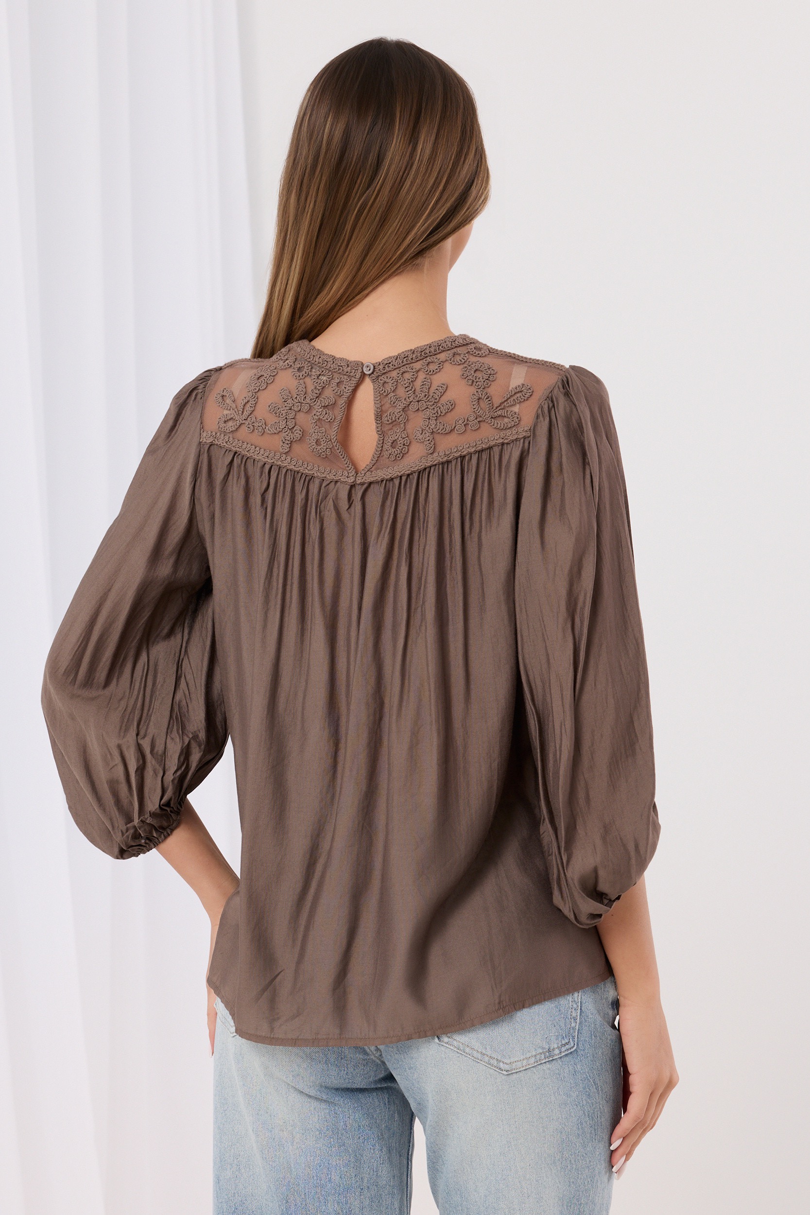 Bluzka w stylu boho z ażurowymi wstawkami brązowa