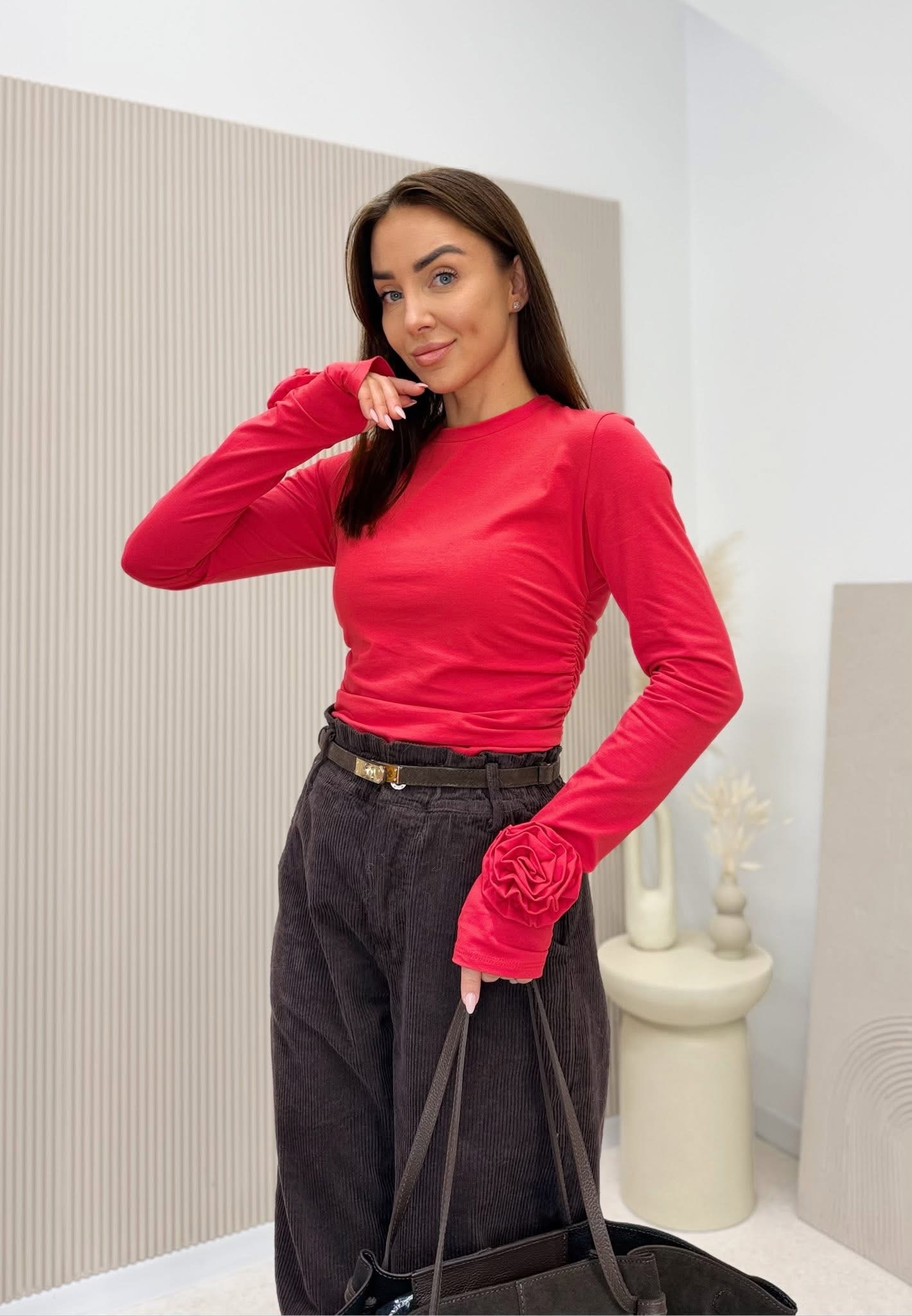 Idealna bluzka z różą na każdą okazję, która łączy klasyczny komfort z najnowszymi trendami. Nasza dopasowana bluzka z długim rękawem, wykonana z wysokiej jakości bawełny z elastanem, to synonim minimalistycznej elegancji z nutą romantycznego detalu.