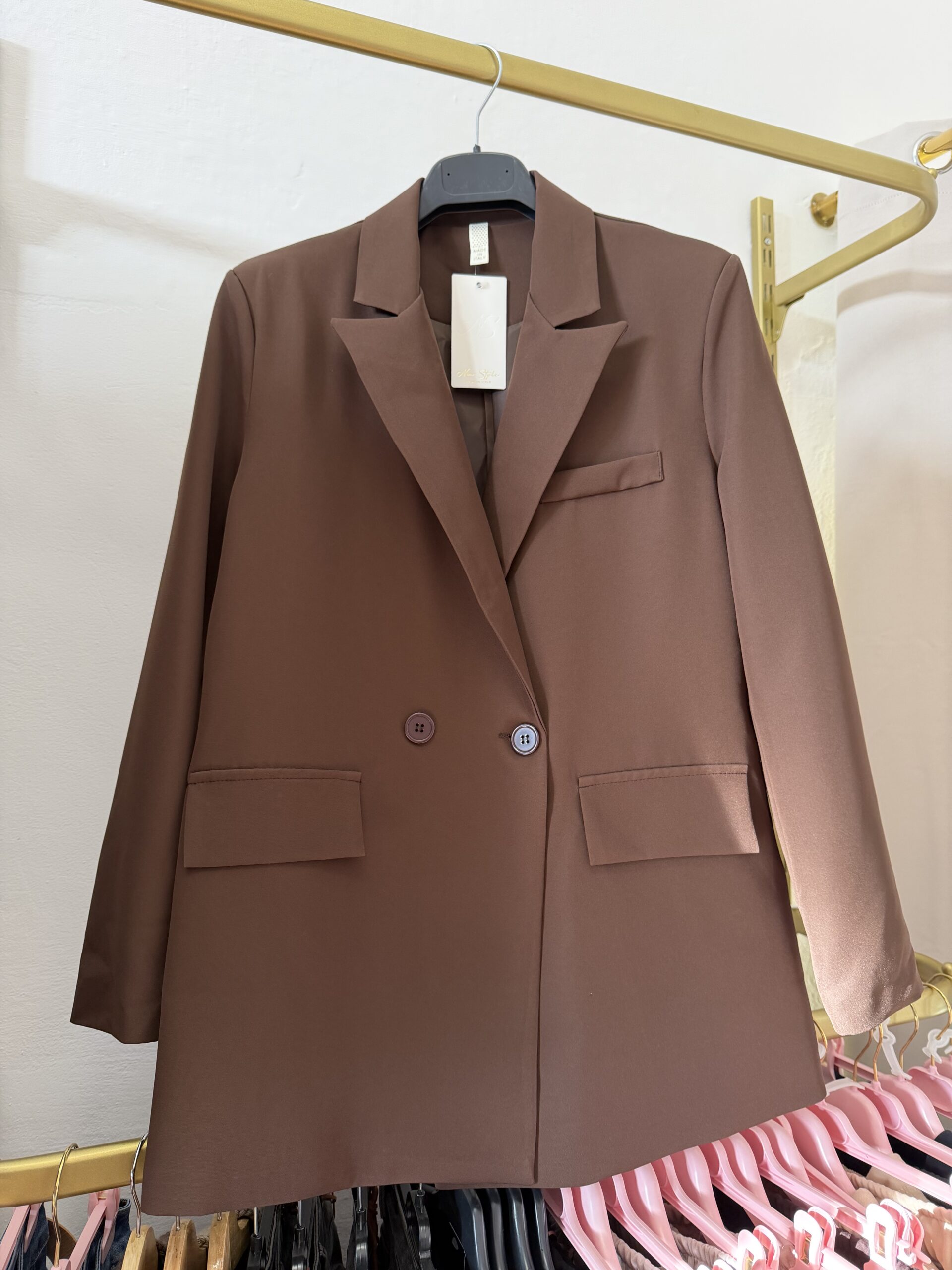 Zdefiniuj swój styl na nowo z nutą męskiej elegancji. Nasza dwurzędowa marynarka w kolorze głębokiej czekolady to hołd dla minimalistycznego designu i nowoczesnych sylwetek. Prosty, wydłużony krój typu boyfriend nadaje każdej stylizacji pewności siebie i luksusowego charakteru.