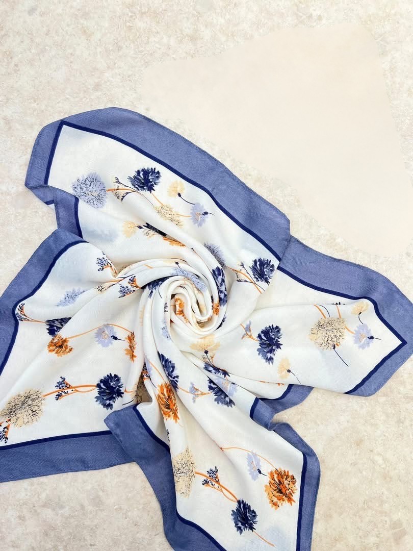 Dodaj swojej stylizacji głębi i szlachetnego charakteru! Nasza kwadratowa gawroszka z granatową lamówką to ponadczasowy dodatek, który łączy w sobie świeżość bieli z elegancją ciemnego niebieskiego. Kwiatowy motyw w odcieniach błękitu i miodu sprawia, że apaszka przyciąga wzrok, pozostając jednocześnie niezwykle szykowną.