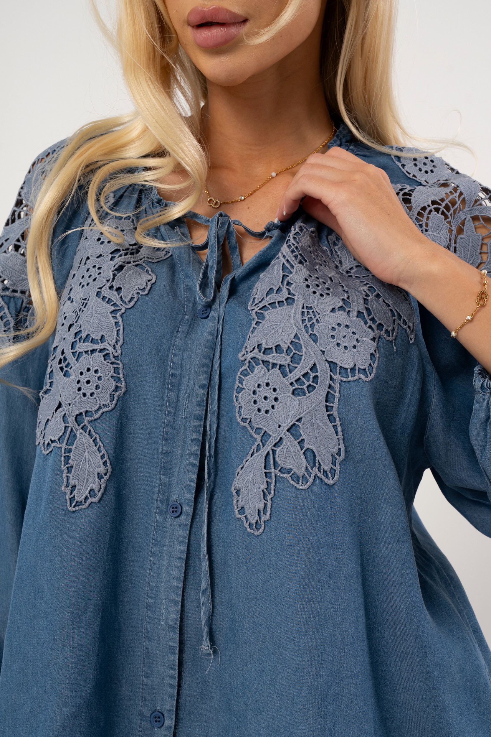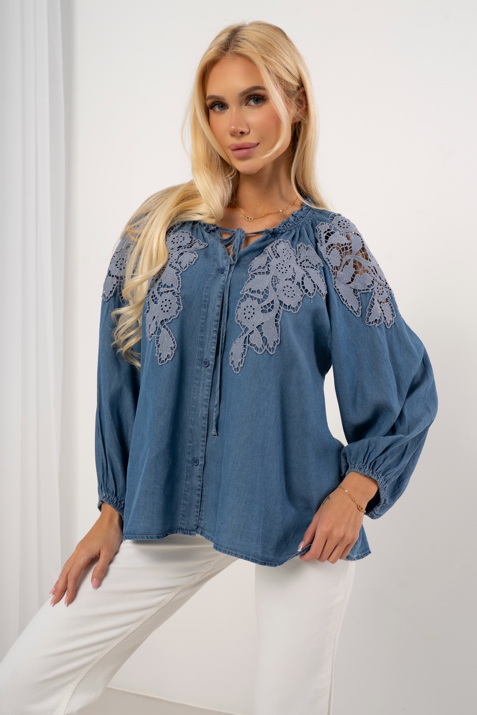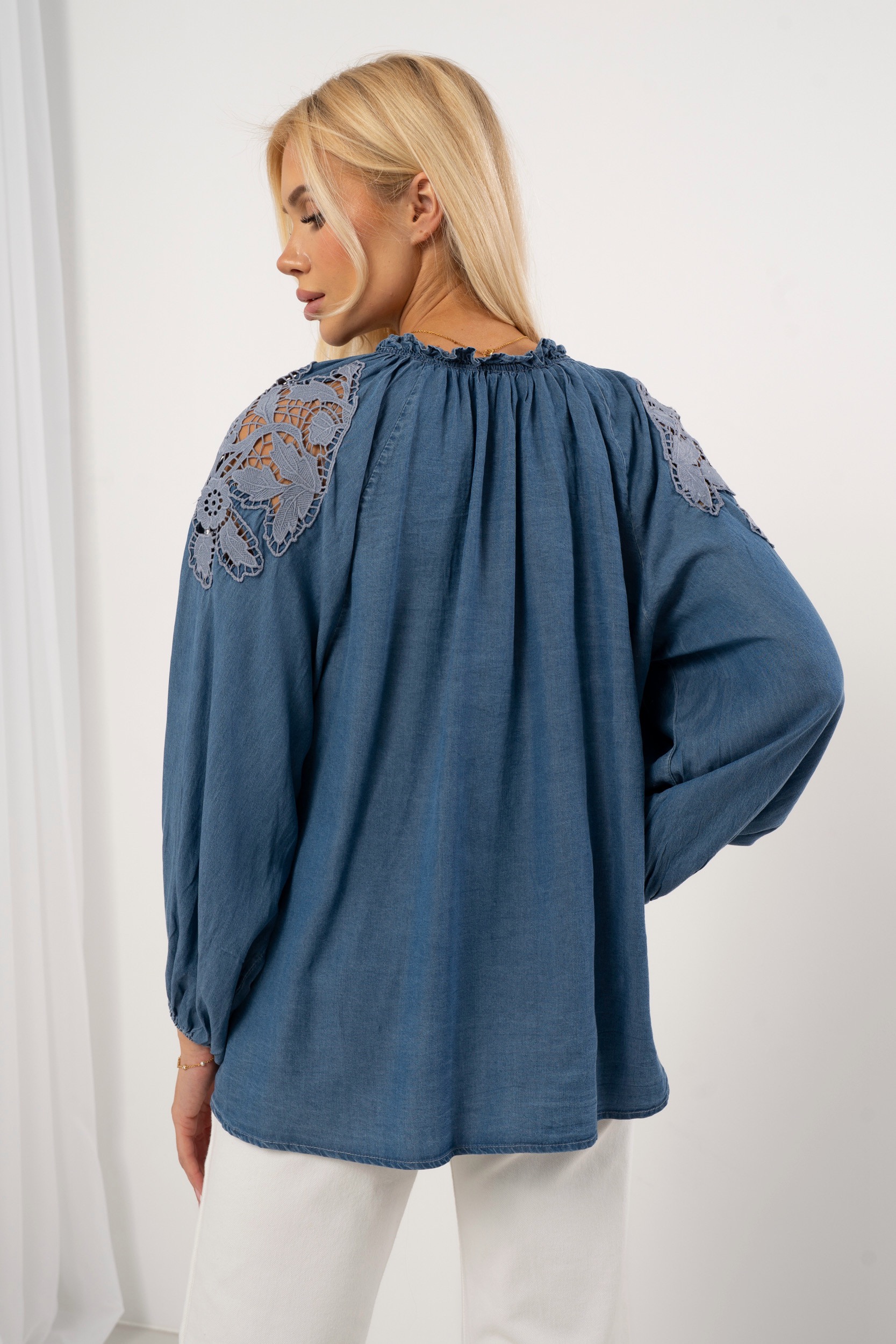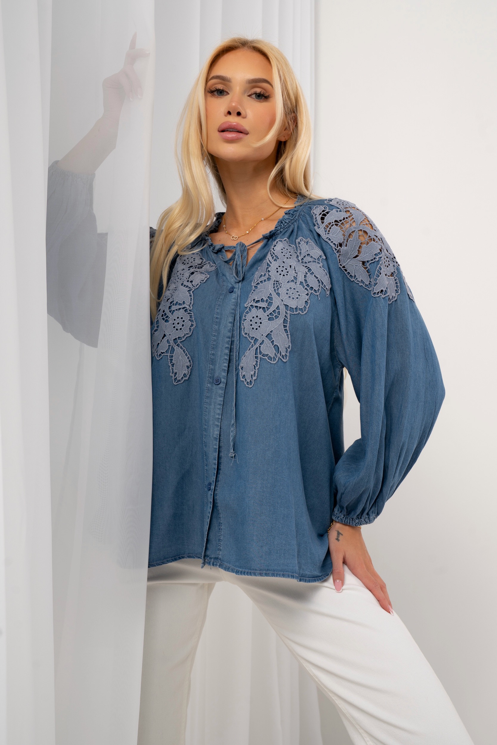Koszula jeansowa z haftowaną gipiurą i bufiastymi rękawami – ciemny jeans