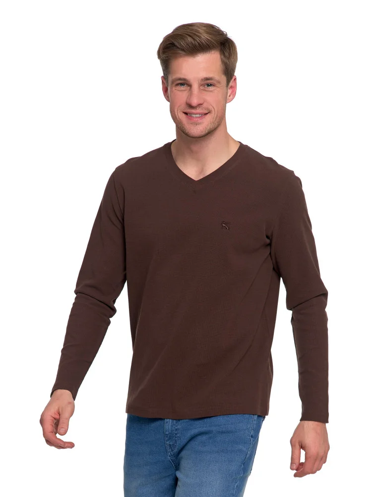 Koszulka męska longsleeve z dekoltem w serek i haftem MORAJ czekolada