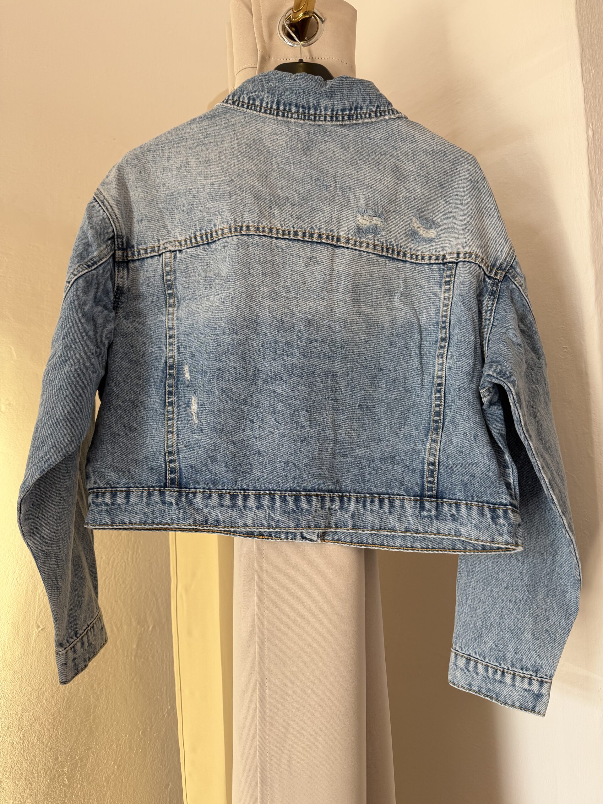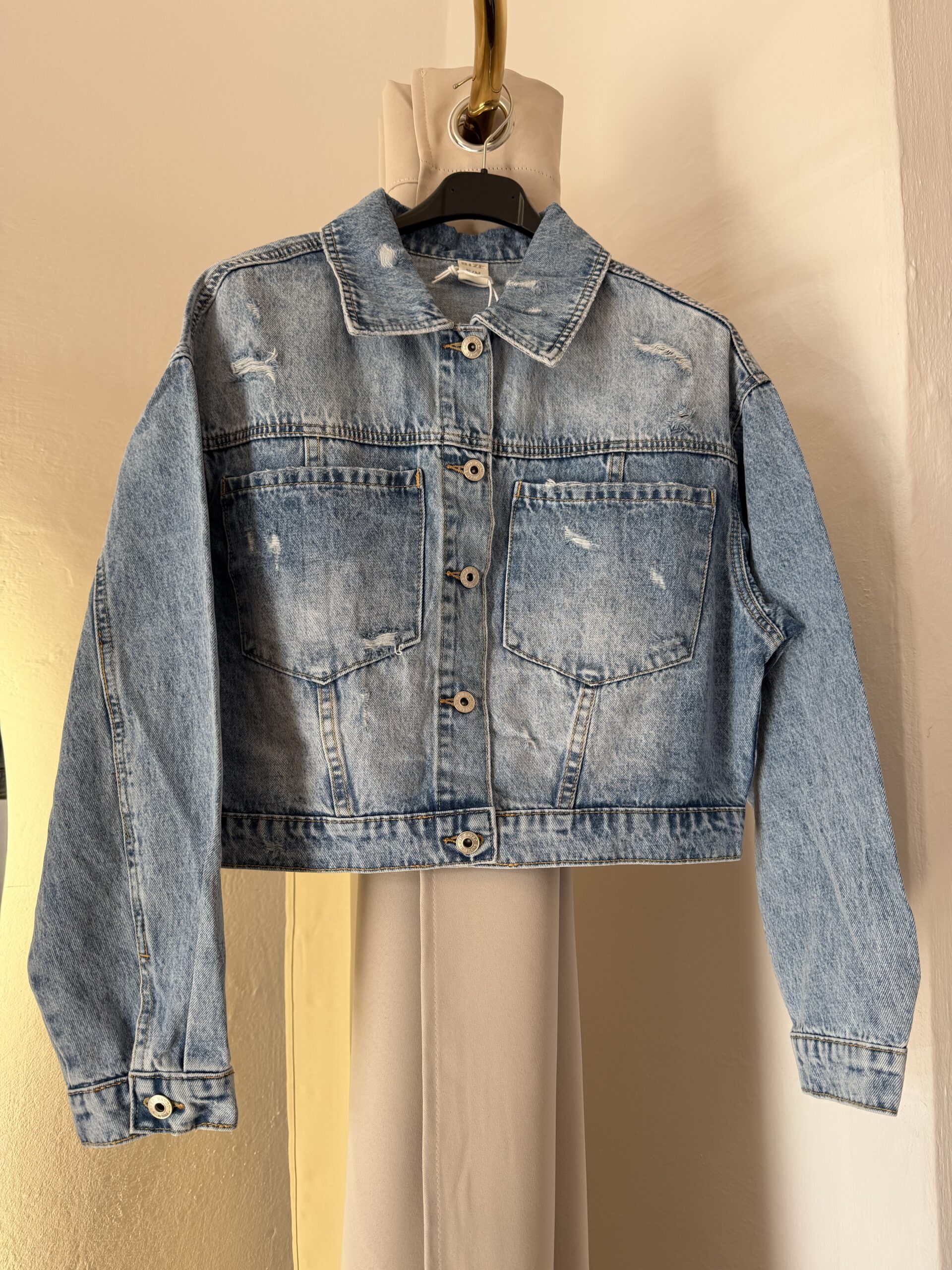 Krótka kurtka jeansowa – oversize’owa katana z przetarciami
