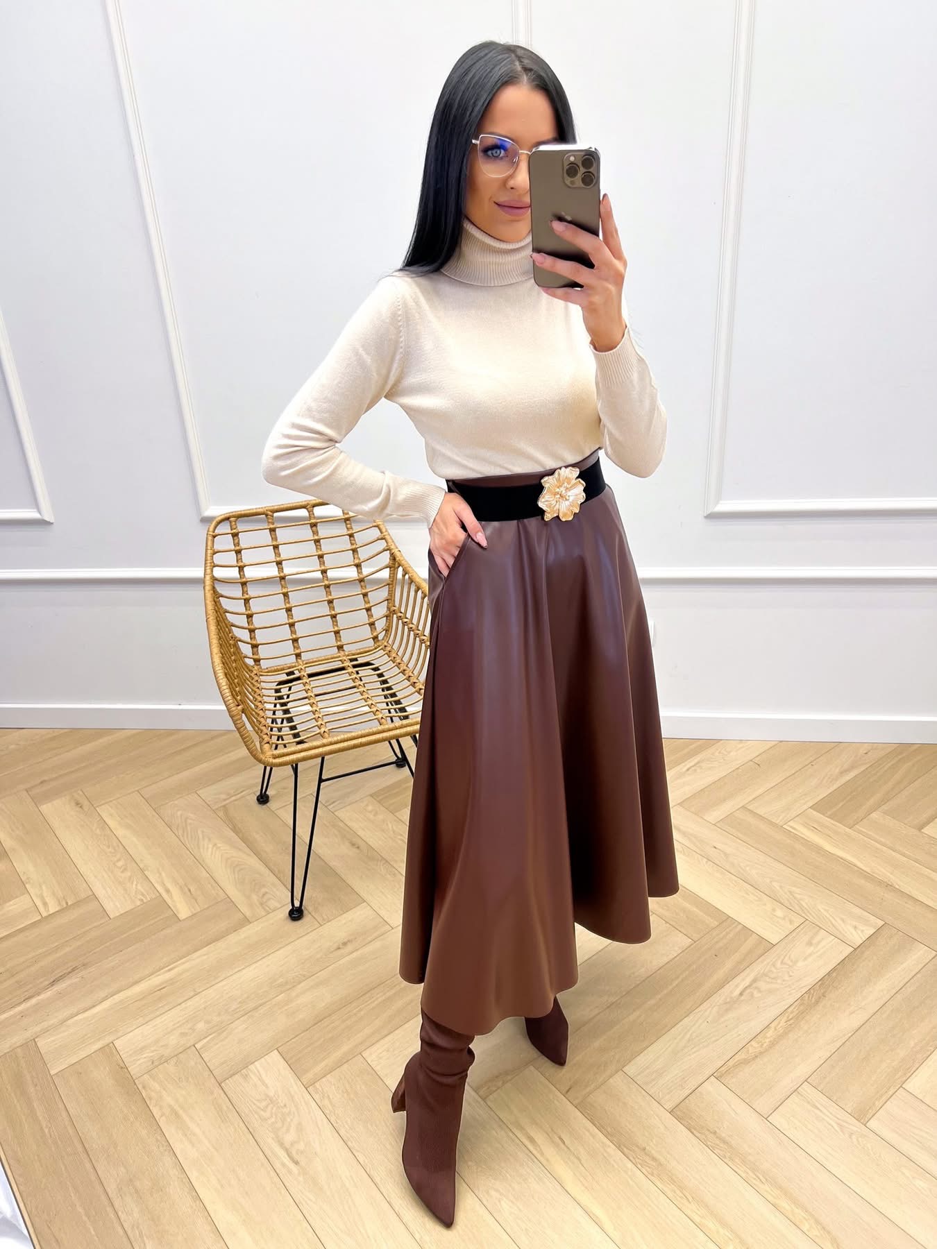 Dostępna w dwóch klasycznych kolorach: głębokiej Czerni i modnym Brązie. Stwórz elegancki, a jednocześnie odważny look na każdą okazję!