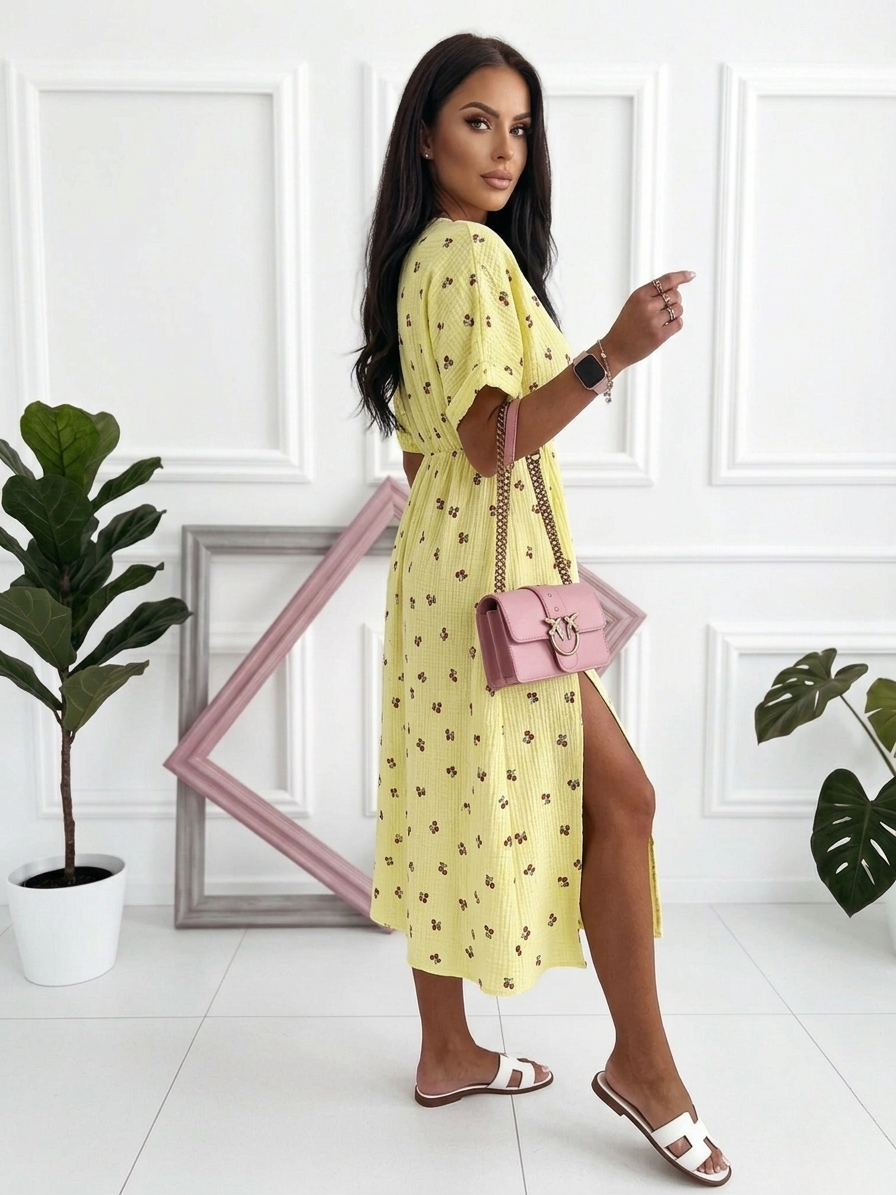 sukienka bawełniana, sukienka z wisienkami, sukienka muślinowa, sukienka kopertowa, sukienka midi na lato, letnia sukienka bawełna, sukienka we wzory, przewiewna sukienka, modna sukienka na wakacje, sukienka z rozcięciem.