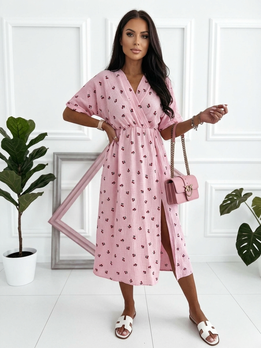 sukienka bawełniana, sukienka z wisienkami, sukienka muślinowa, sukienka kopertowa, sukienka midi na lato, letnia sukienka bawełna, sukienka we wzory, przewiewna sukienka, modna sukienka na wakacje, sukienka z rozcięciem.