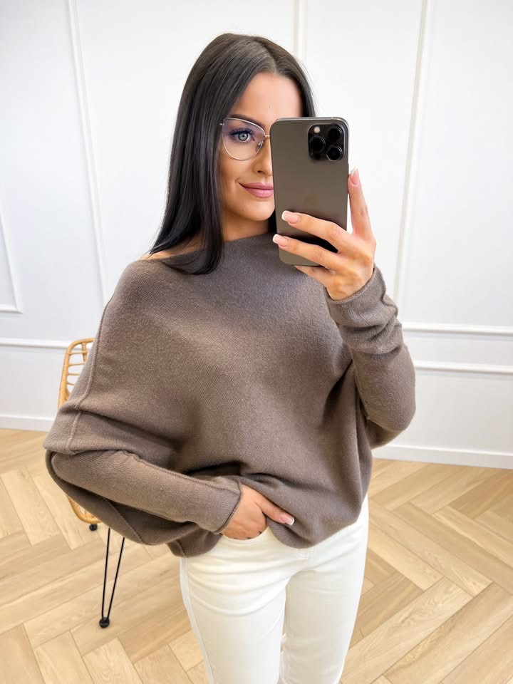 - Obniżona Linia Ramion: Dodaje sweterkowi nowoczesnego, nonszalanckiego charakteru.