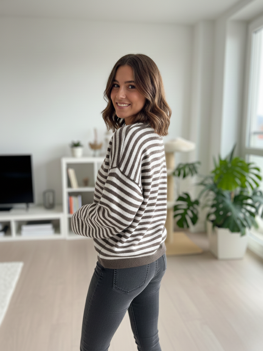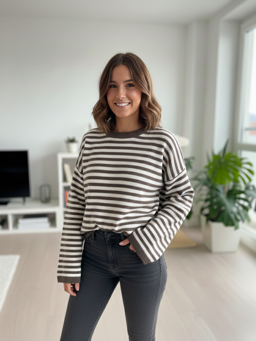 Odkryj nasz wyjątkowy sweter, który łączy klasyczne pasy z modnym, luźniejszym krojem. To idealny wybór na chłodniejsze dni, gwarantujący komfort i styl.